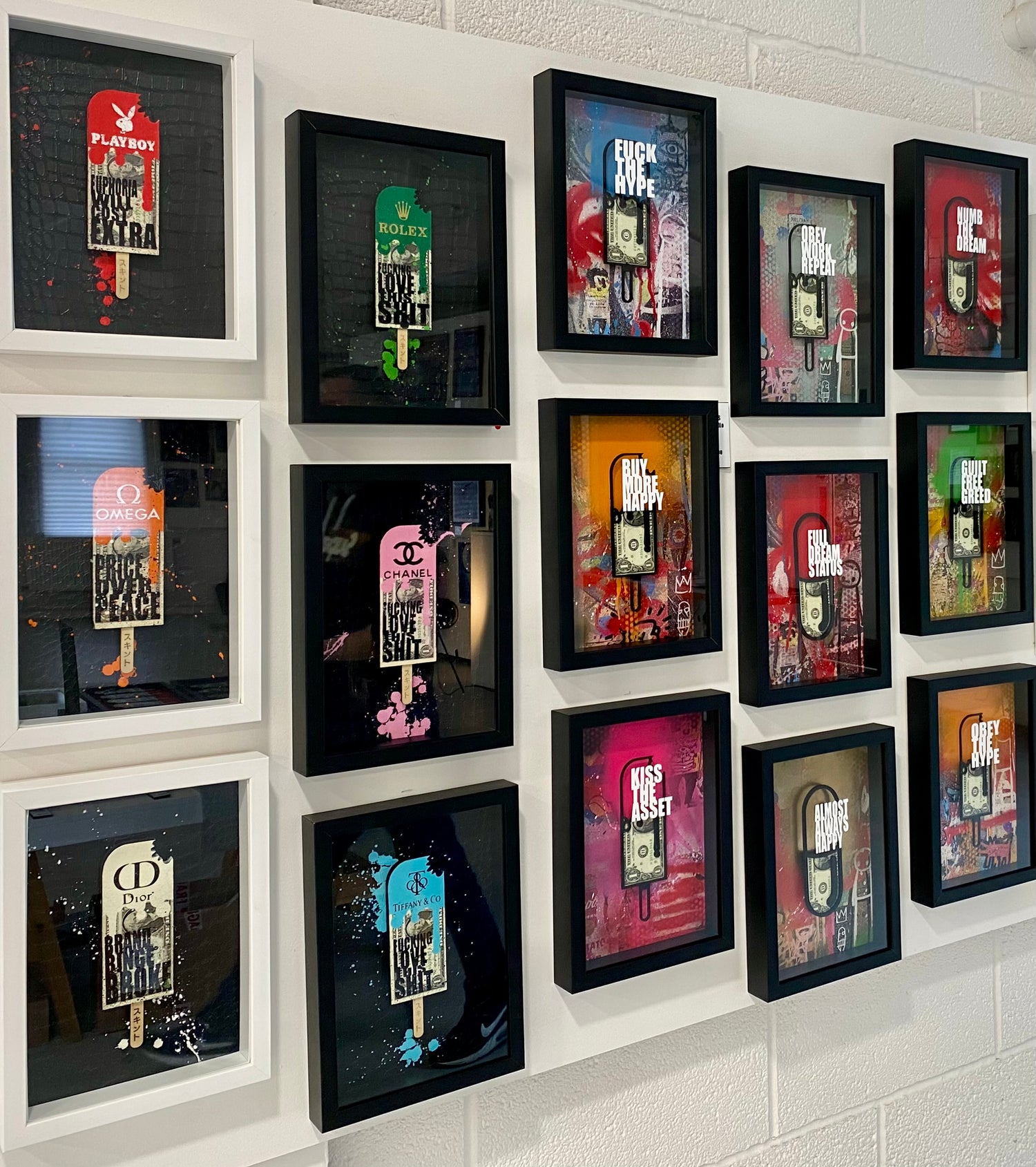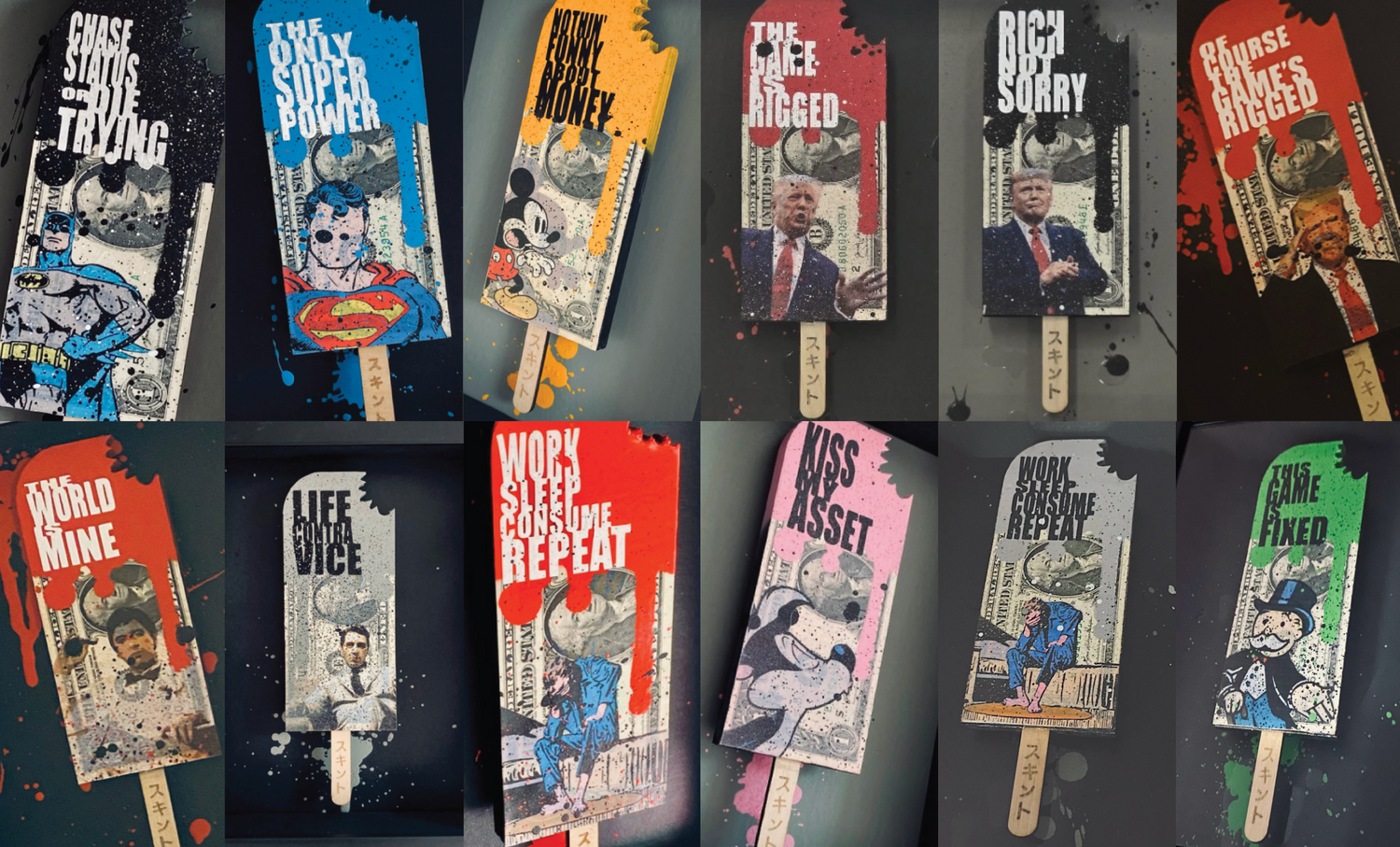 Real money, sculptured iconic images and symbols disarming the seduction of consumerism and its short lived instant gratification.